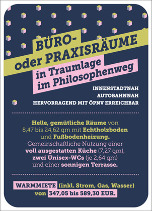 Sehr schöne Gemeinschaftsbüroräume in Traumlage im Philosophenweg. Innenstadtnah, autobahnnah und gut erreichbar mit dem ÖPNV.